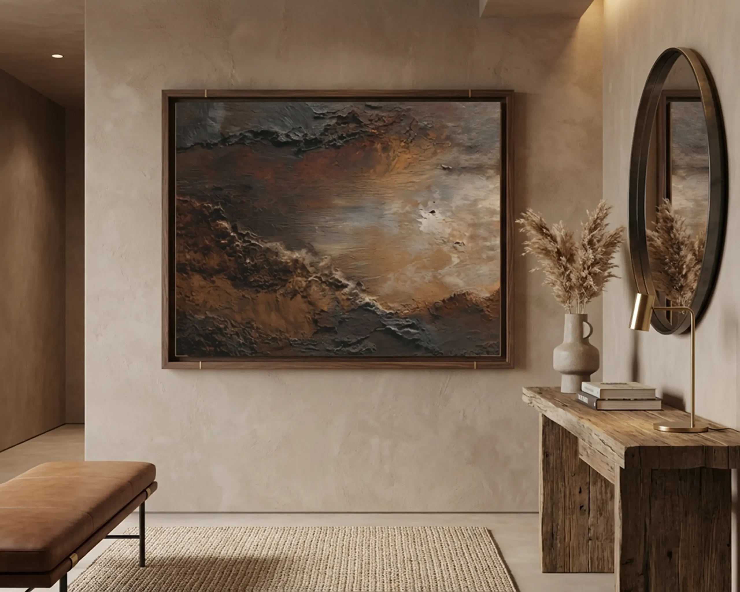 Idéale pour un intérieur contemporain, un espace professionnel ou un lieu culturel, cette création apporte caractère, authenticité et intensité. Elle séduira les amateurs d’art abstrait matiériste, sensibles à la force du geste, à la richesse des textures et à la capacité de la peinture à traduire la puissance silencieuse de la nature.
