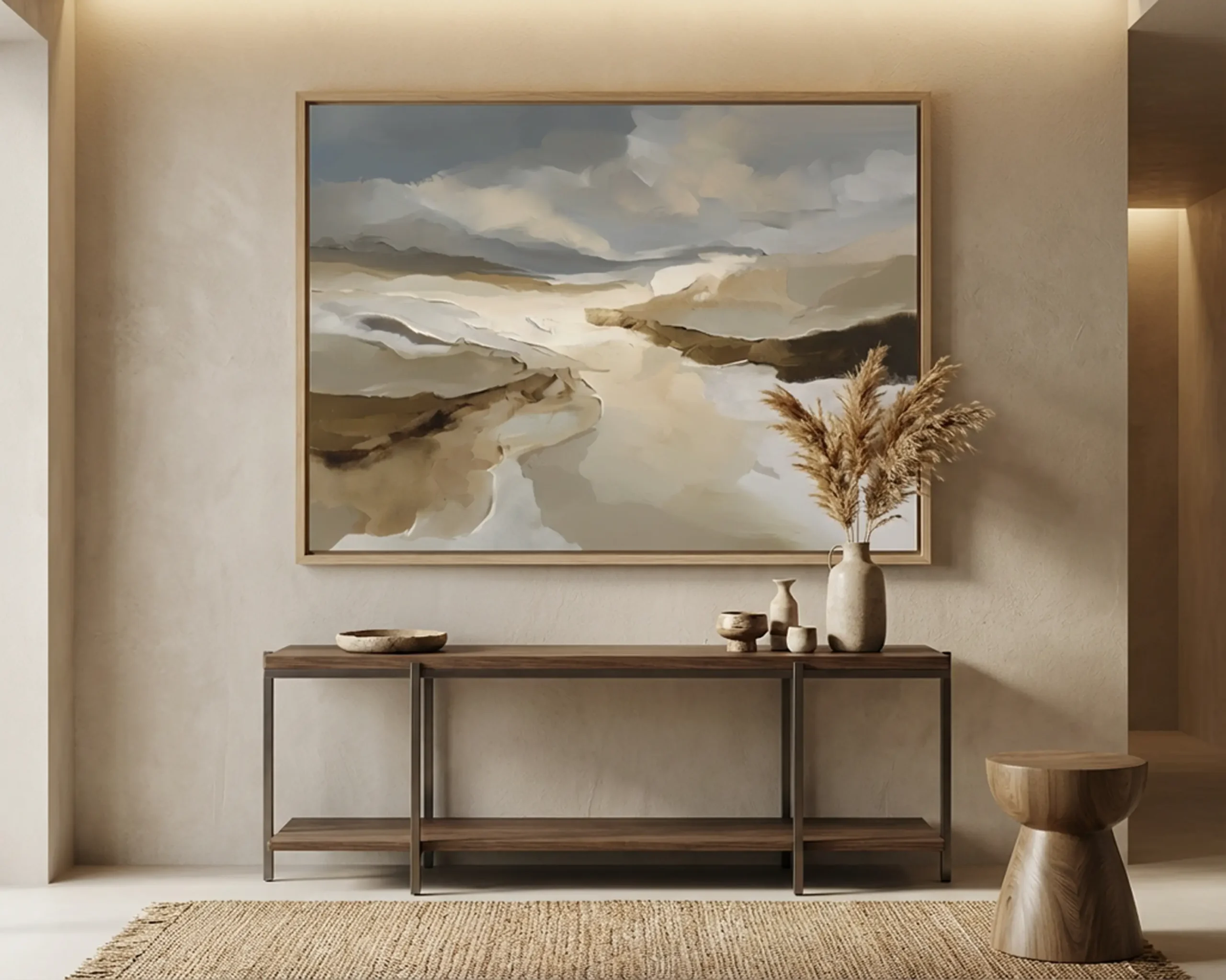 Parfait pour un intérieur contemporain, minimaliste ou naturel, ce tableau apporte une impression de clarté et de respiration à l’espace. Il séduira les amateurs d’art abstrait paysager, sensibles aux palettes douces, aux atmosphères lumineuses et à la capacité de la peinture à évoquer le silence, l’espace et le temps sans recours à la figuration explicite.