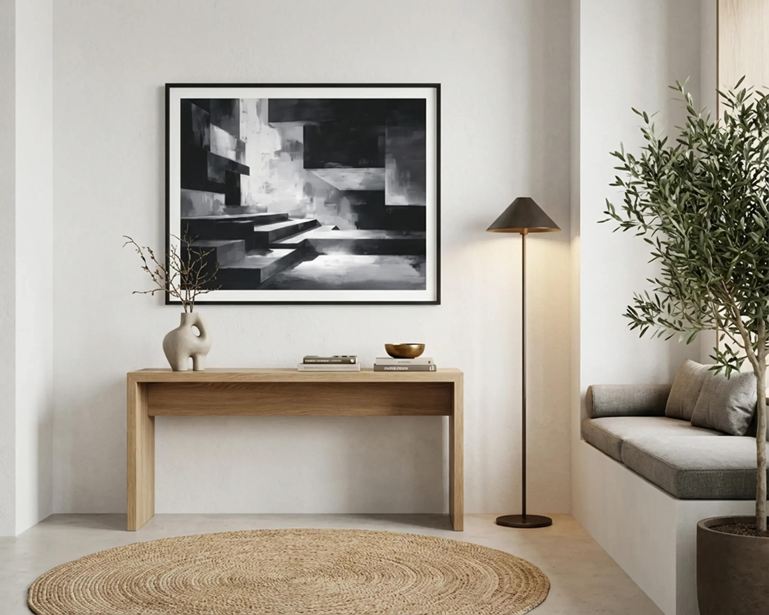 Cette œuvre invite à une contemplation introspective, où l’espace devient un état mental autant qu’un lieu. Elle s’intègre parfaitement dans un intérieur contemporain, un bureau design ou un espace culturel, apportant caractère, profondeur et intensité. Elle séduira les amateurs d’art abstrait architectural, sensibles aux jeux de lumière, à la rigueur des formes et à la puissance évocatrice de la composition monochrome.