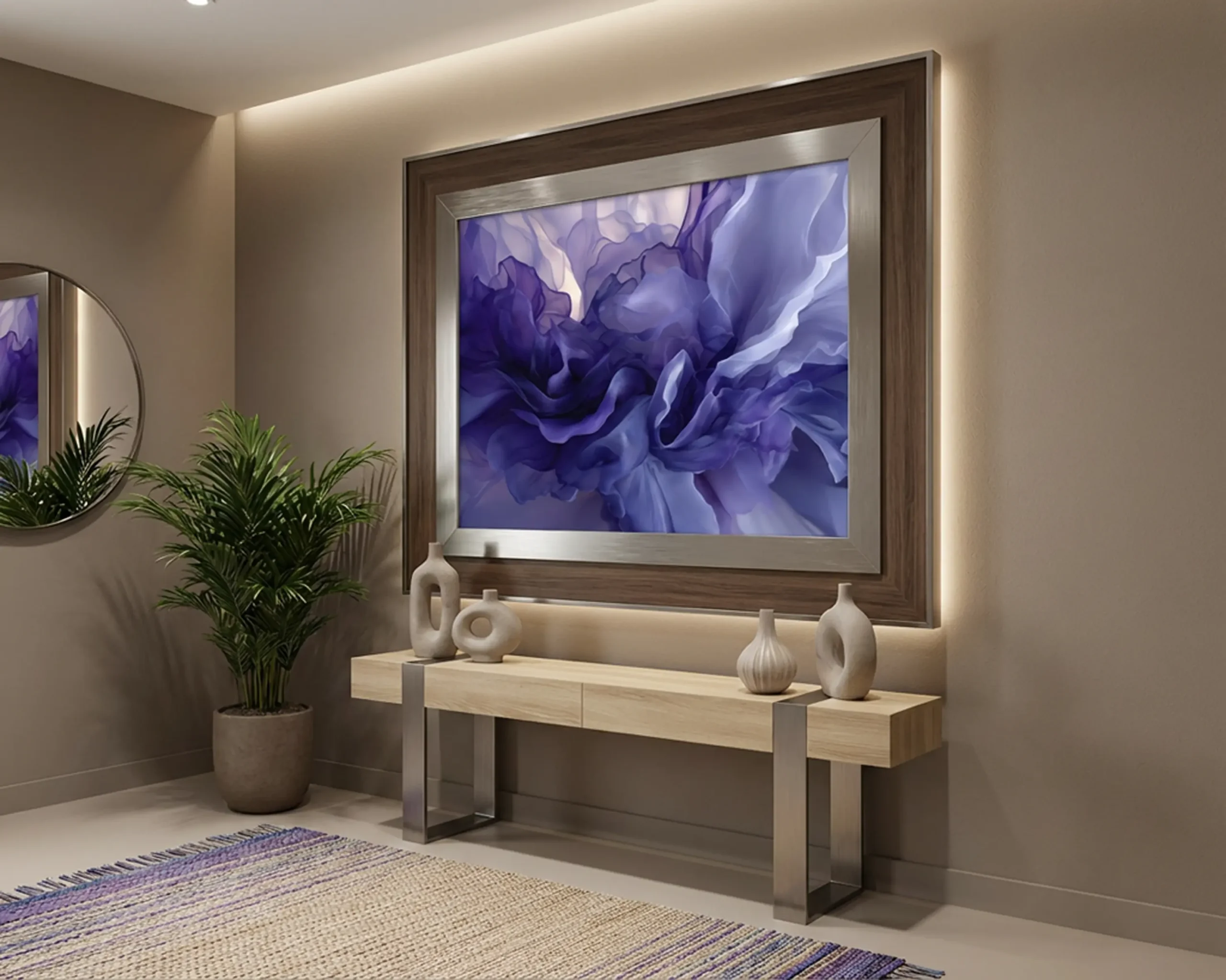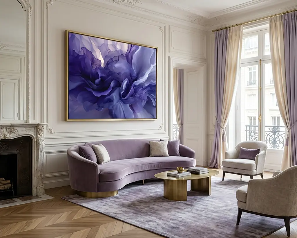 Tableau abstrait aux formes vaporeuses et aux nuances de violet, indigo et lavande. Une œuvre fluide et immersive, évoquant le mouvement, la légèreté et une émotion presque aérienne.