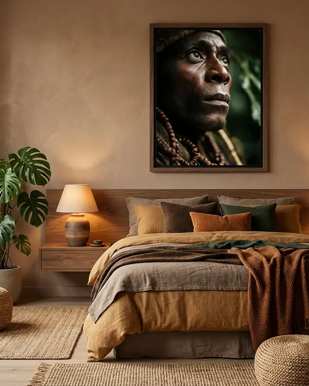 Batwa Man est une œuvre originale de la série Peuples du Monde par Graphic Avenue, mettant en lumière la dignité silencieuse, la mémoire ancestrale et la relation profonde à la nature des peuples Batwa d’Afrique centrale.