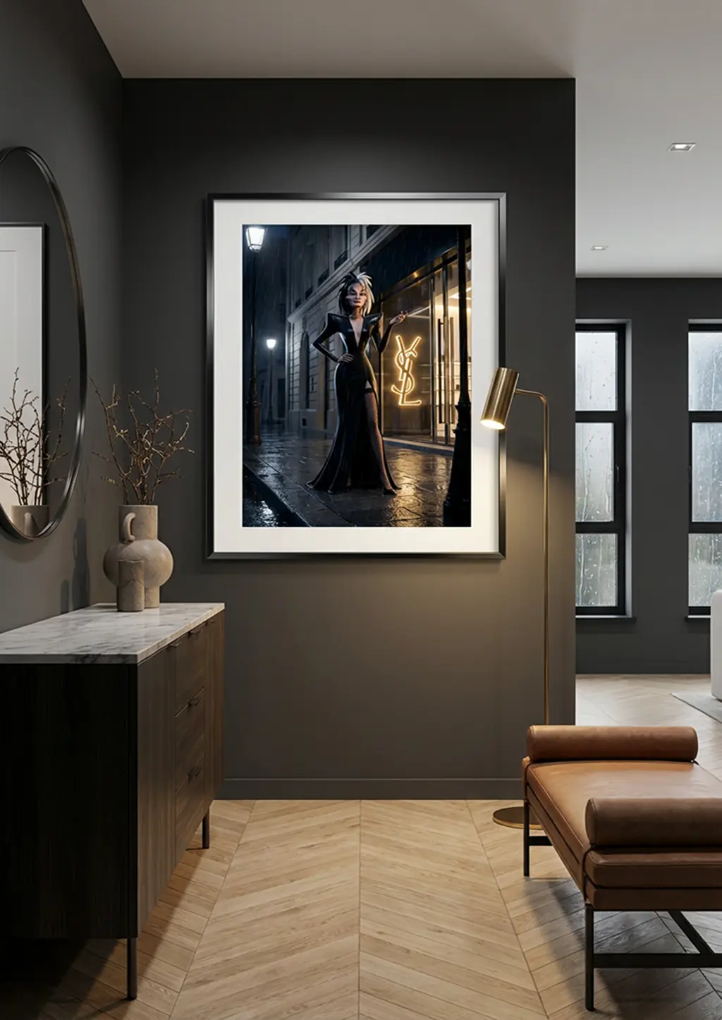 Cruella × Yves Saint Laurent est une œuvre originale Graphic Avenue qui fusionne l’iconique anti-héroïne de l’animation avec l’esthétique sophistiquée, nocturne et tranchante de la maison Yves Saint Laurent. Dans une rue parisienne élégante, sous la pluie et la lumière des réverbères, Cruella avance avec assurance, silhouette sculpturale et regard provocateur.