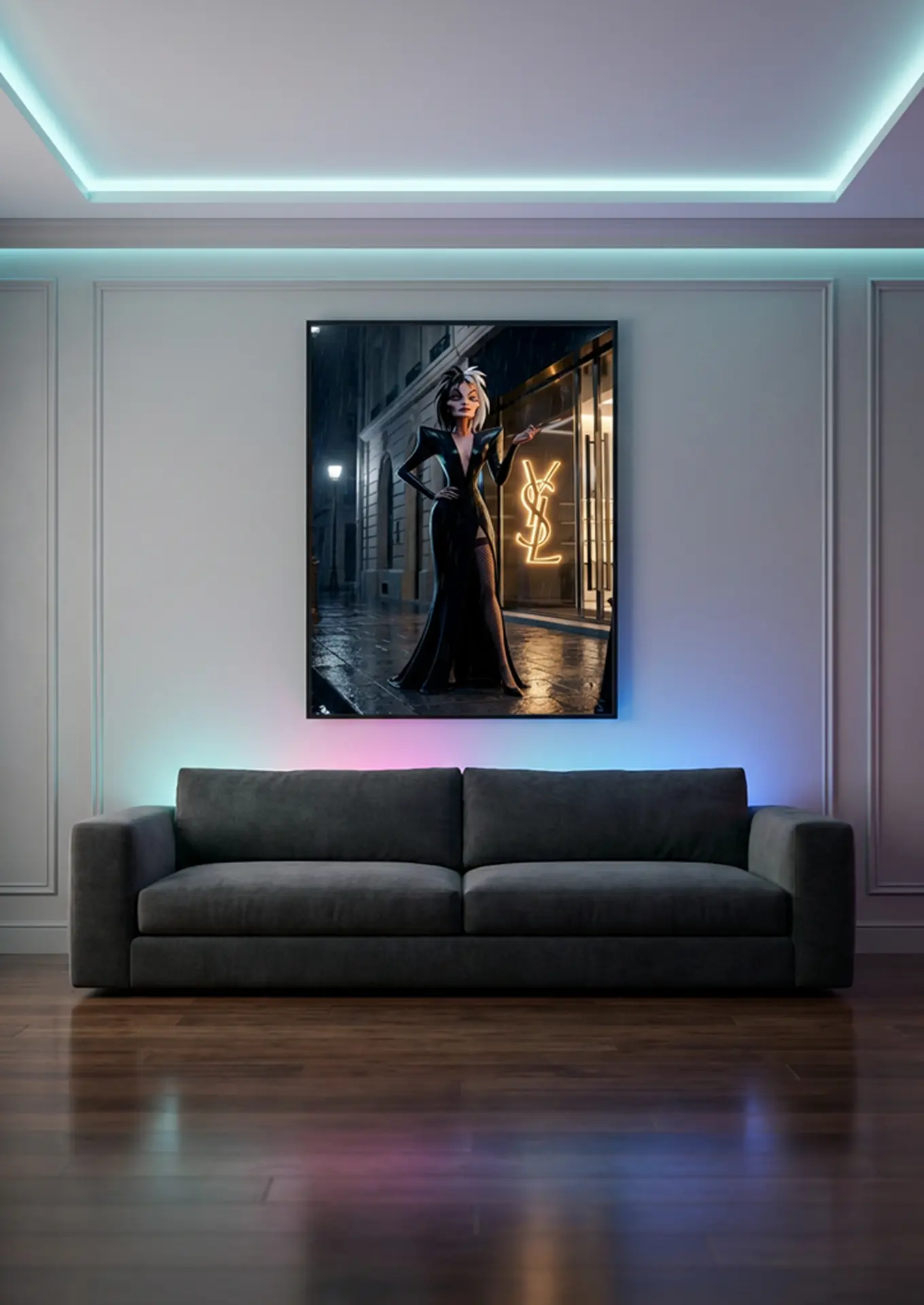 Le décor parisien et l’enseigne lumineuse YSL en arrière-plan inscrivent l’œuvre dans un univers de luxe intemporel, où la nuit devient un terrain d’expression artistique. Cruella n’est plus une antagoniste caricaturale : elle devient un symbole de liberté créative, d’insolence maîtrisée et de rébellion élégante.