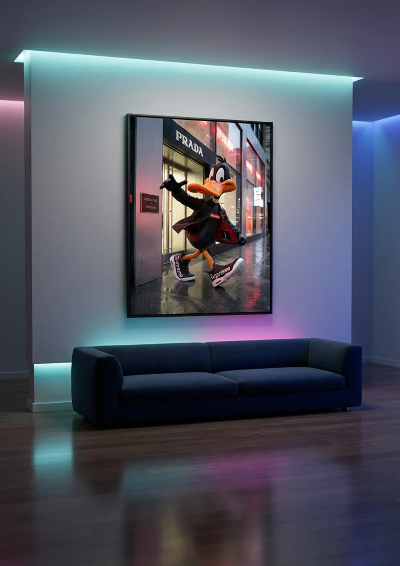 Daffy Duck × Supreme × Prada est une œuvre originale Graphic Avenue qui met en scène l’irrévérence légendaire du personnage dans un décor urbain luxueux, au cœur des codes du streetwear et de la haute mode. Avançant avec assurance devant une boutique Prada, Daffy Duck adopte une attitude conquérante, symbole d’indépendance, d’humour et de provocation assumée.