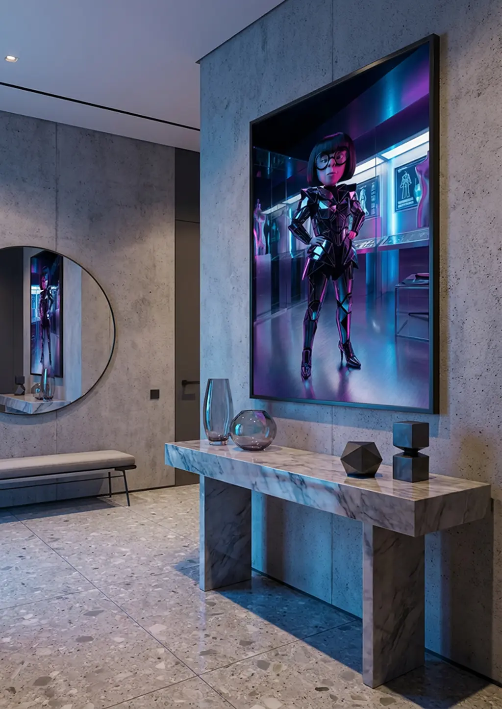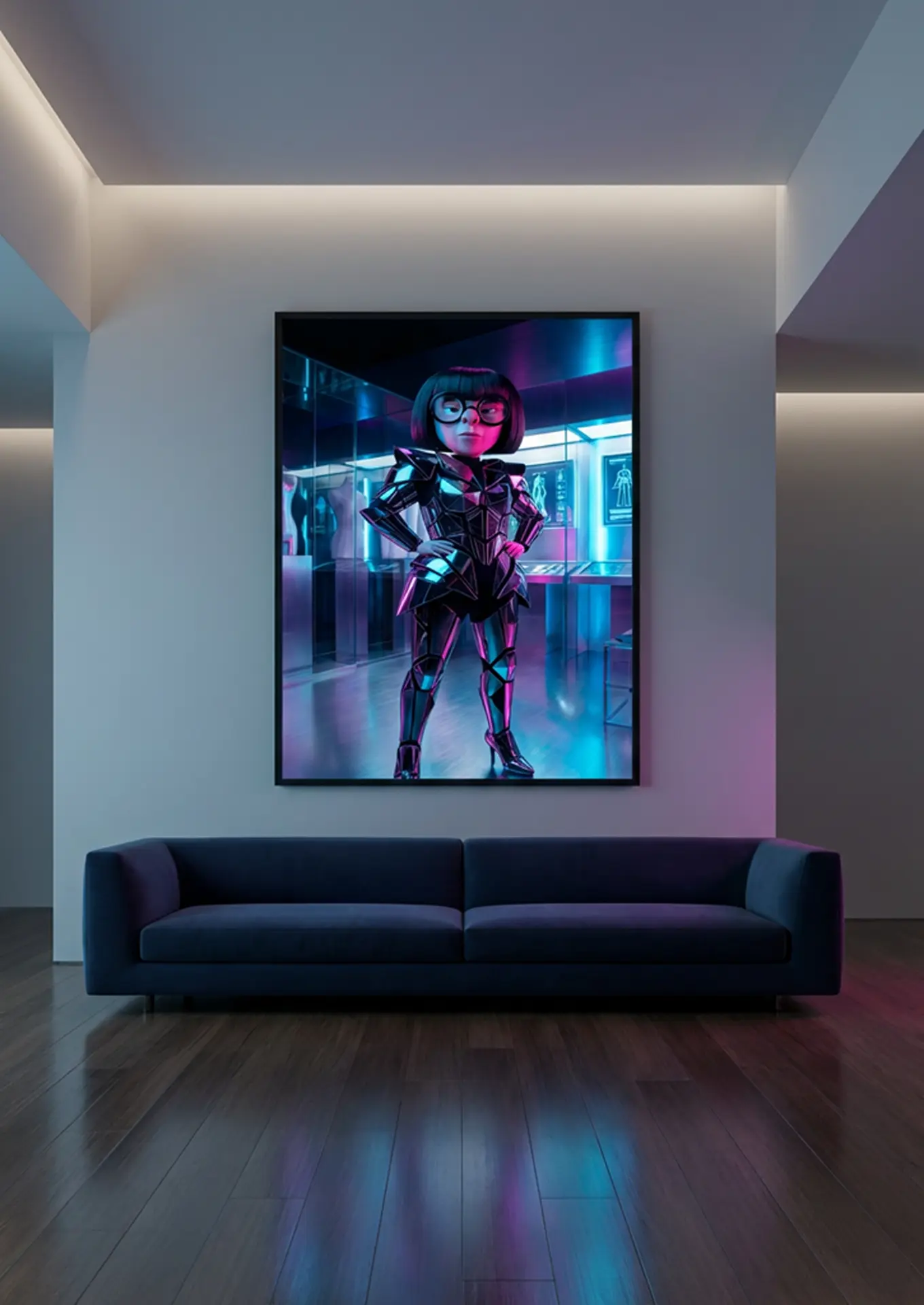 L’éclairage néon et les reflets chromés renforcent l’atmosphère futuriste, transformant la scène en laboratoire créatif où le design repousse les limites du corps et de la forme. Edna Mode n’est plus seulement un personnage animé, elle devient une icône conceptuelle, incarnation de l’intelligence créative et du refus de la banalité.