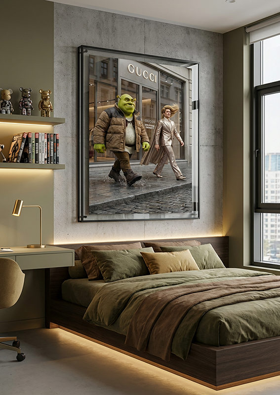 Fairytale Fashion Clash est une œuvre originale signée Graphic Avenue qui met en scène un choc visuel entre l’univers du conte revisité et l’esthétique luxueuse de Gucci. Installée dans un décor urbain contemporain, la scène détourne les archétypes de la fiction pour les projeter dans le monde réel, là où la mode devient un langage narratif à part entière.