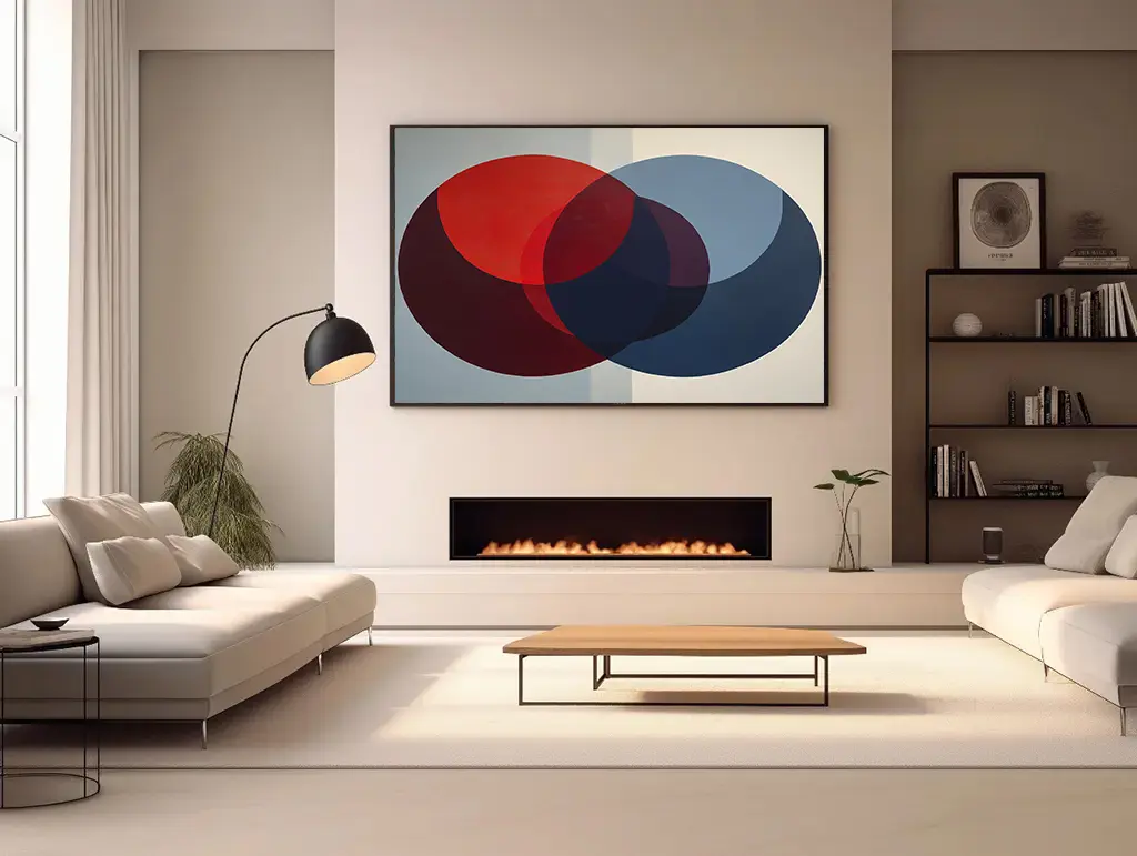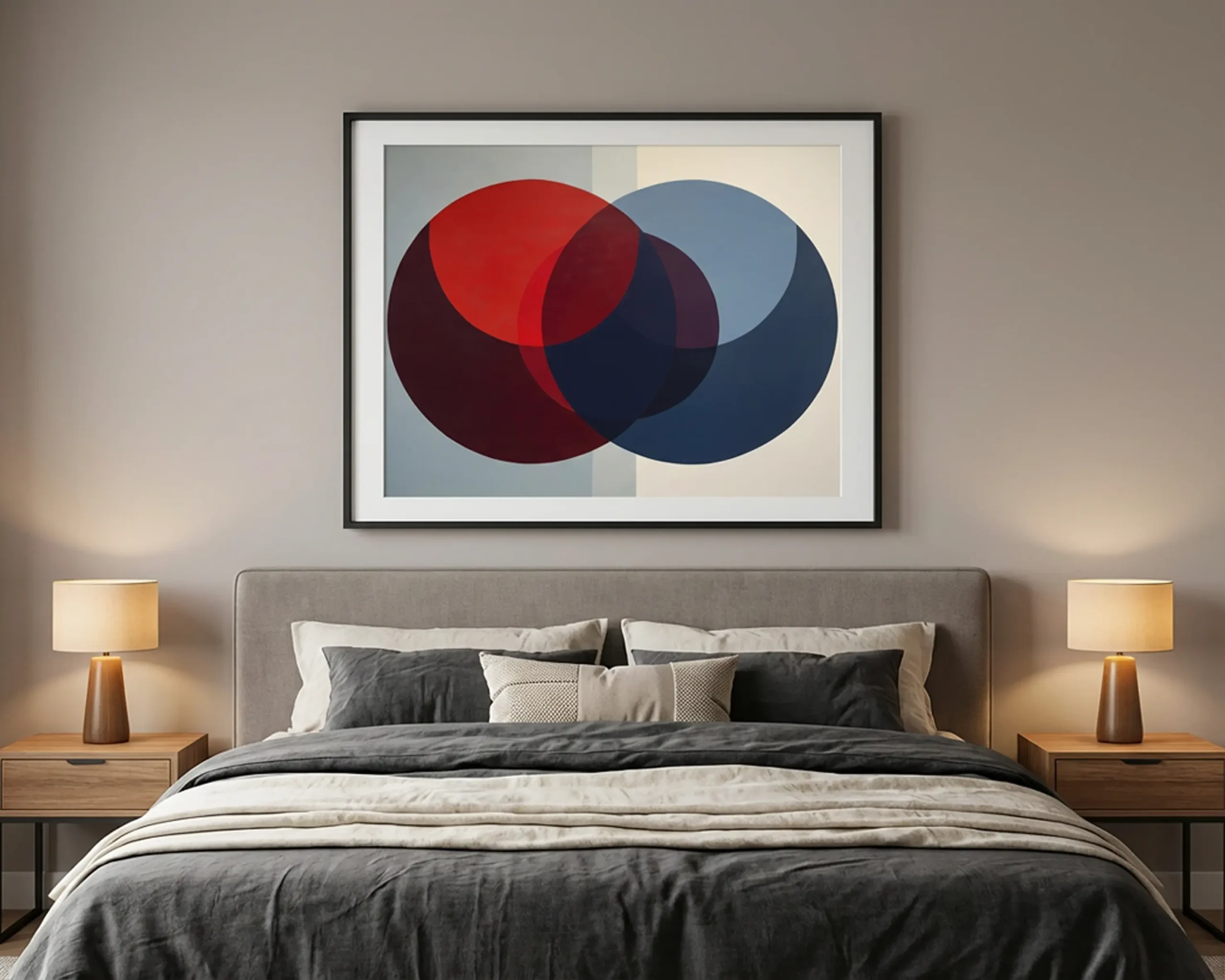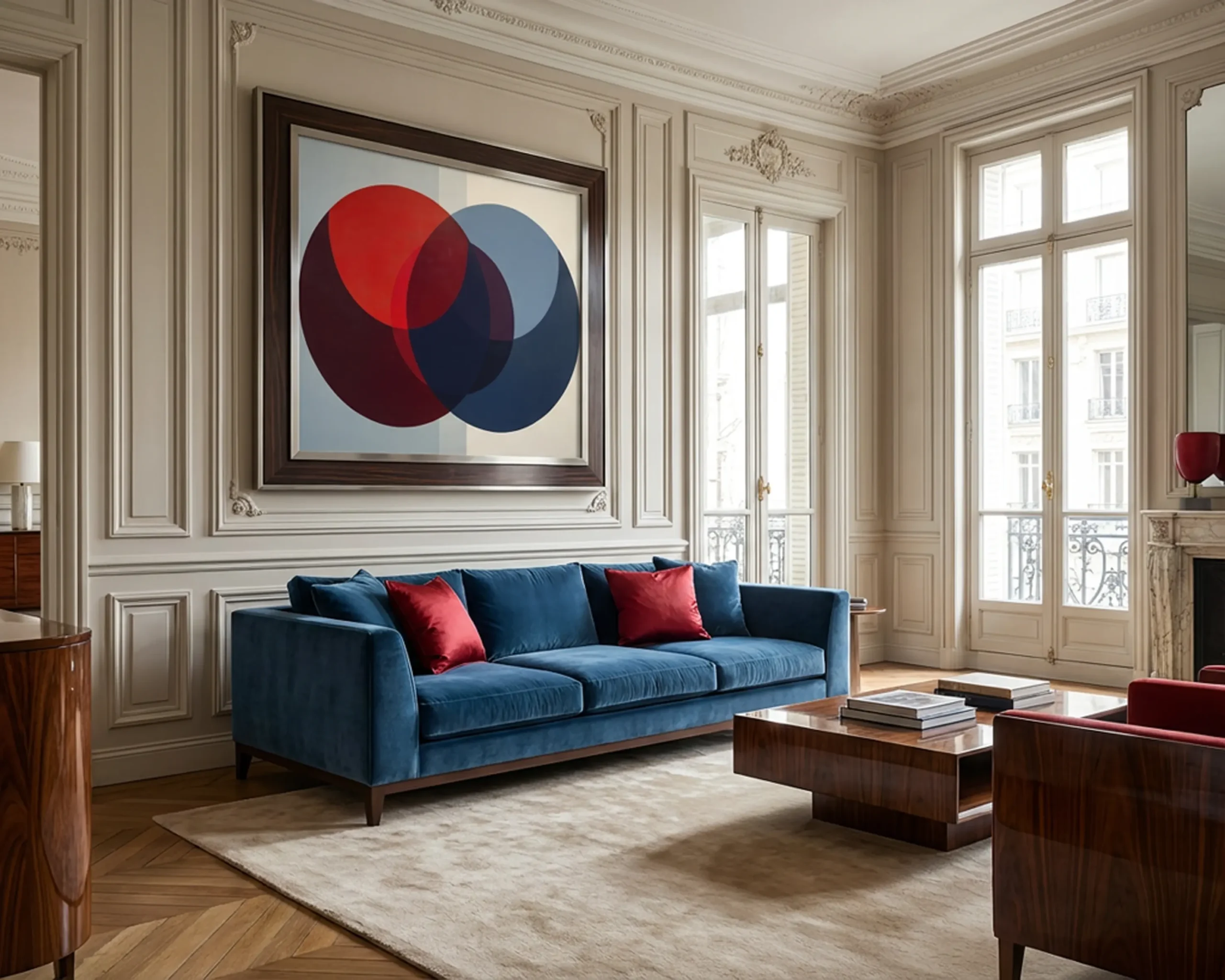 Ce tableau rend hommage à l’approche radicale et épurée d’Ellsworth Kelly, figure majeure de l’abstraction géométrique. La composition repose sur la superposition de cercles aux contours nets, dont les aplats de couleur s’entrecroisent et se répondent avec une précision silencieuse. Le rouge intense et le bleu profond créent un jeu de transparence visuelle et de tension équilibrée, sans jamais recourir à l’illusion ou à la narration.