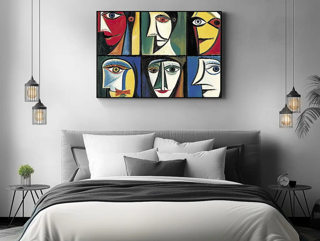 Ce tableau rend hommage à l’univers cubiste de Pablo Picasso à travers une composition structurée en plusieurs panneaux, chacun présentant un visage stylisé et déconstruit. Les figures, traitées selon des points de vue multiples, semblent à la fois distinctes et liées, formant un ensemble rythmé et cohérent.