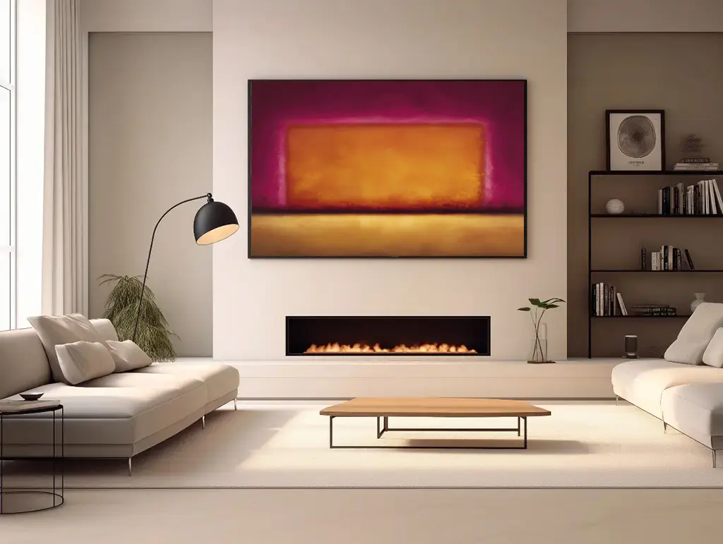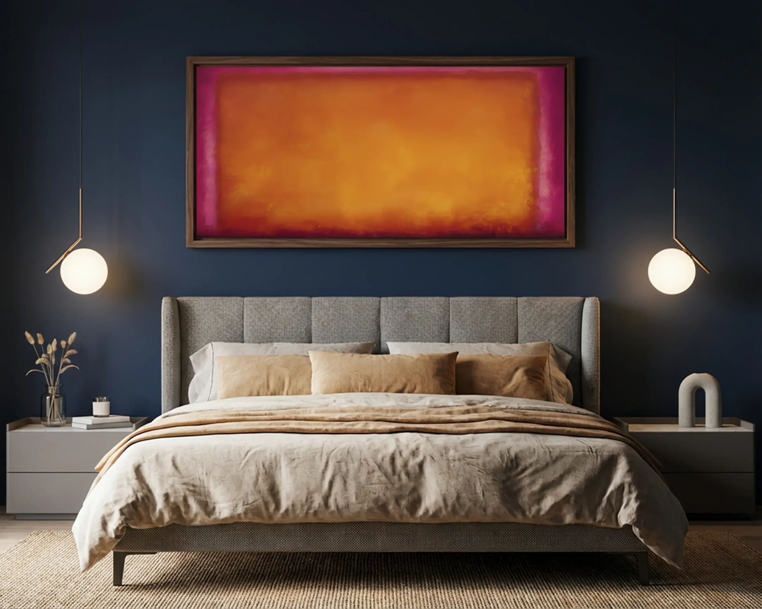 Tableau abstrait hommage à Rothko, centré sur un rectangle orange lumineux flottant sur un fond pourpre profond et une base dorée. Une œuvre puissante et méditative, jouant sur la lumière, la profondeur et l’émotion pure.