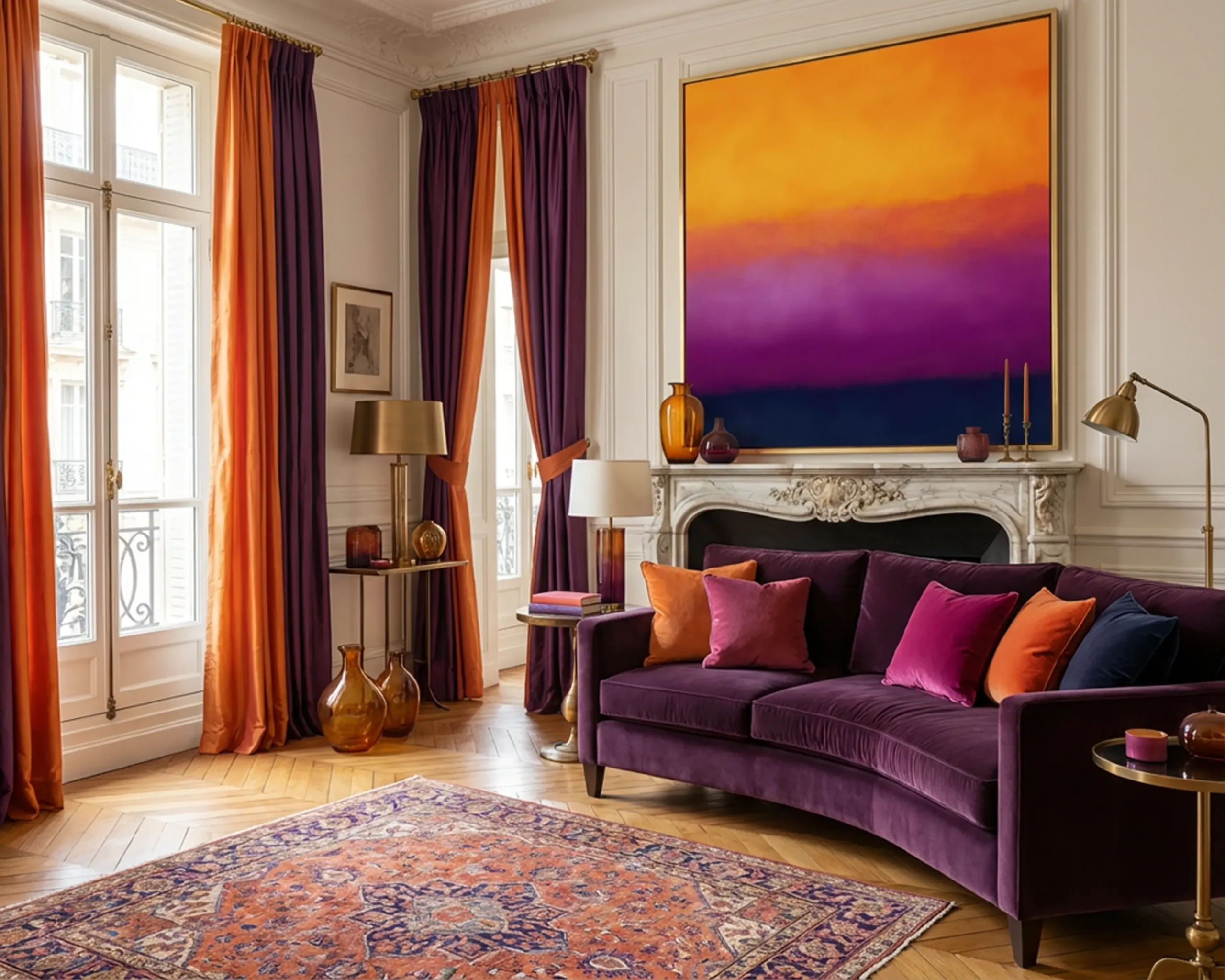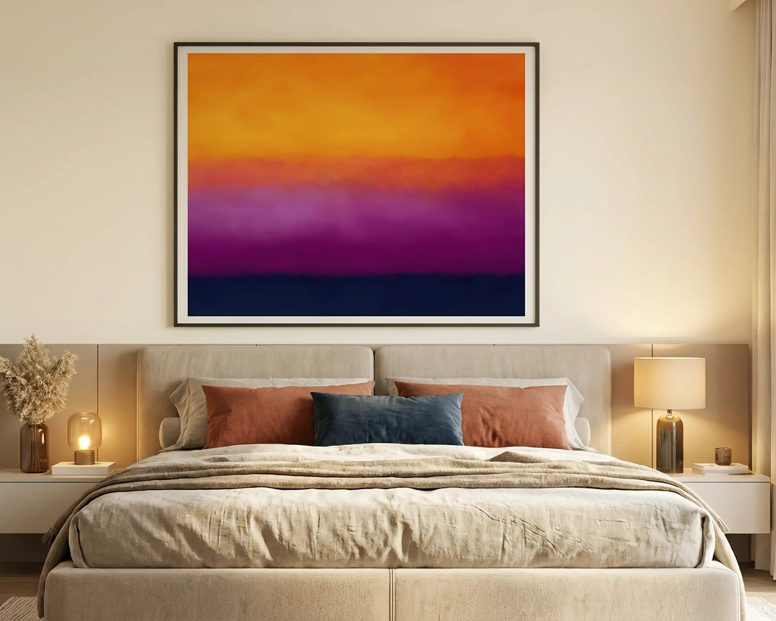 Tableau abstrait hommage à Rothko, structuré par de vastes champs de couleur orange incandescent, violet profond et bleu sombre. Une œuvre vibrante et émotionnelle, conçue pour créer une atmosphère chaleureuse, contemplative et intensément expressive.