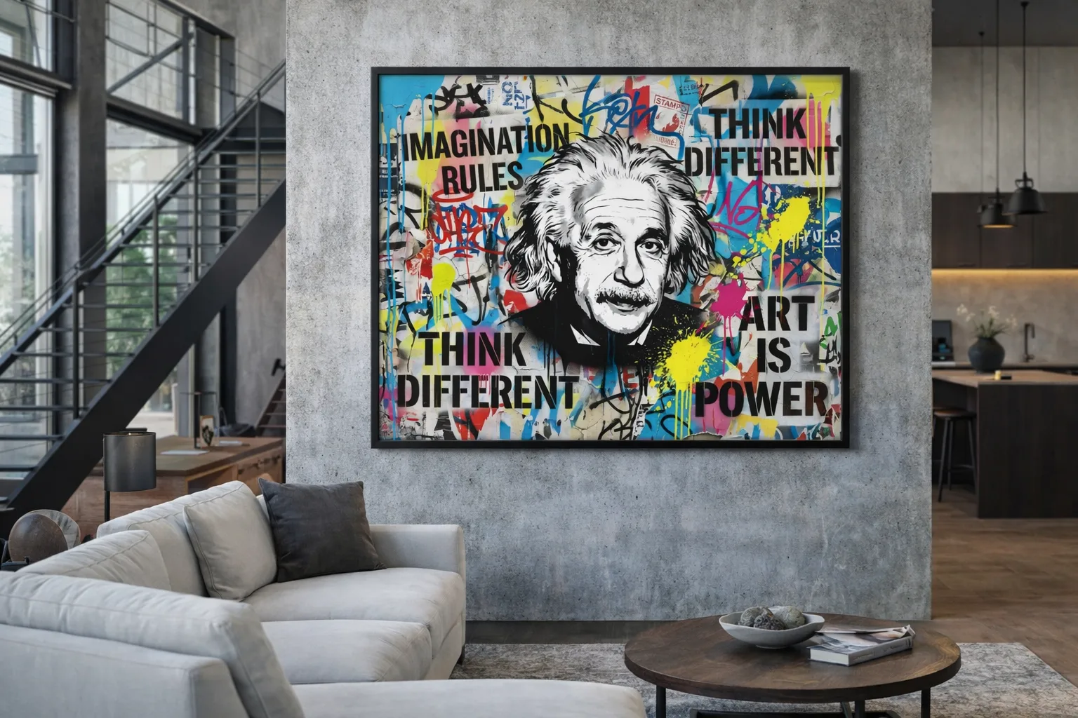 Le portrait d’Einstein, traité en noir et blanc, s’impose au cœur d’un mur urbain explosif, saturé de graffitis, de couleurs vives et de slogans puissants. Les mots Imagination Rules, Think Different et Art Is Power s’entrelacent autour du visage comme des éclats de pensée, transformant la science en manifeste artistique.