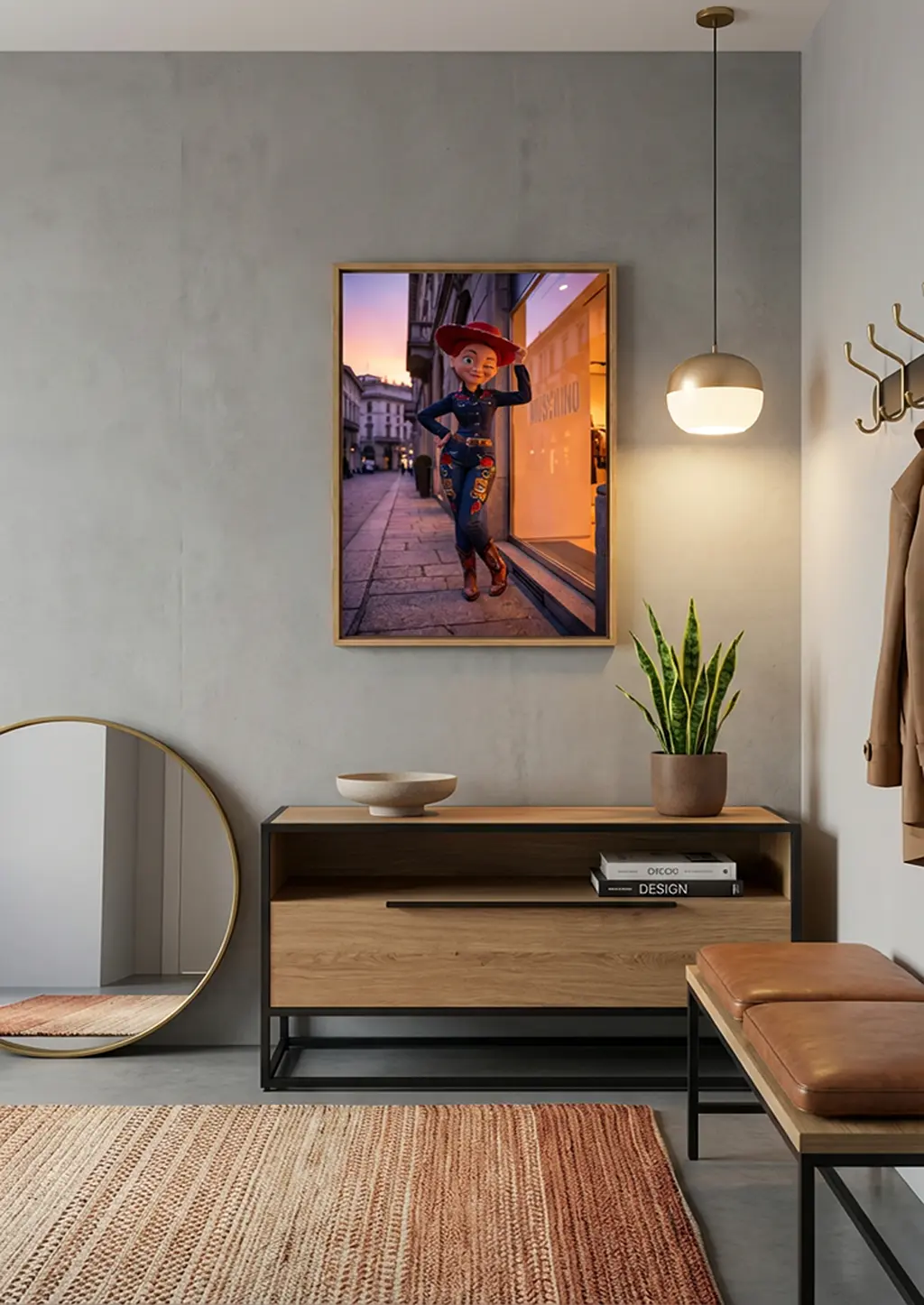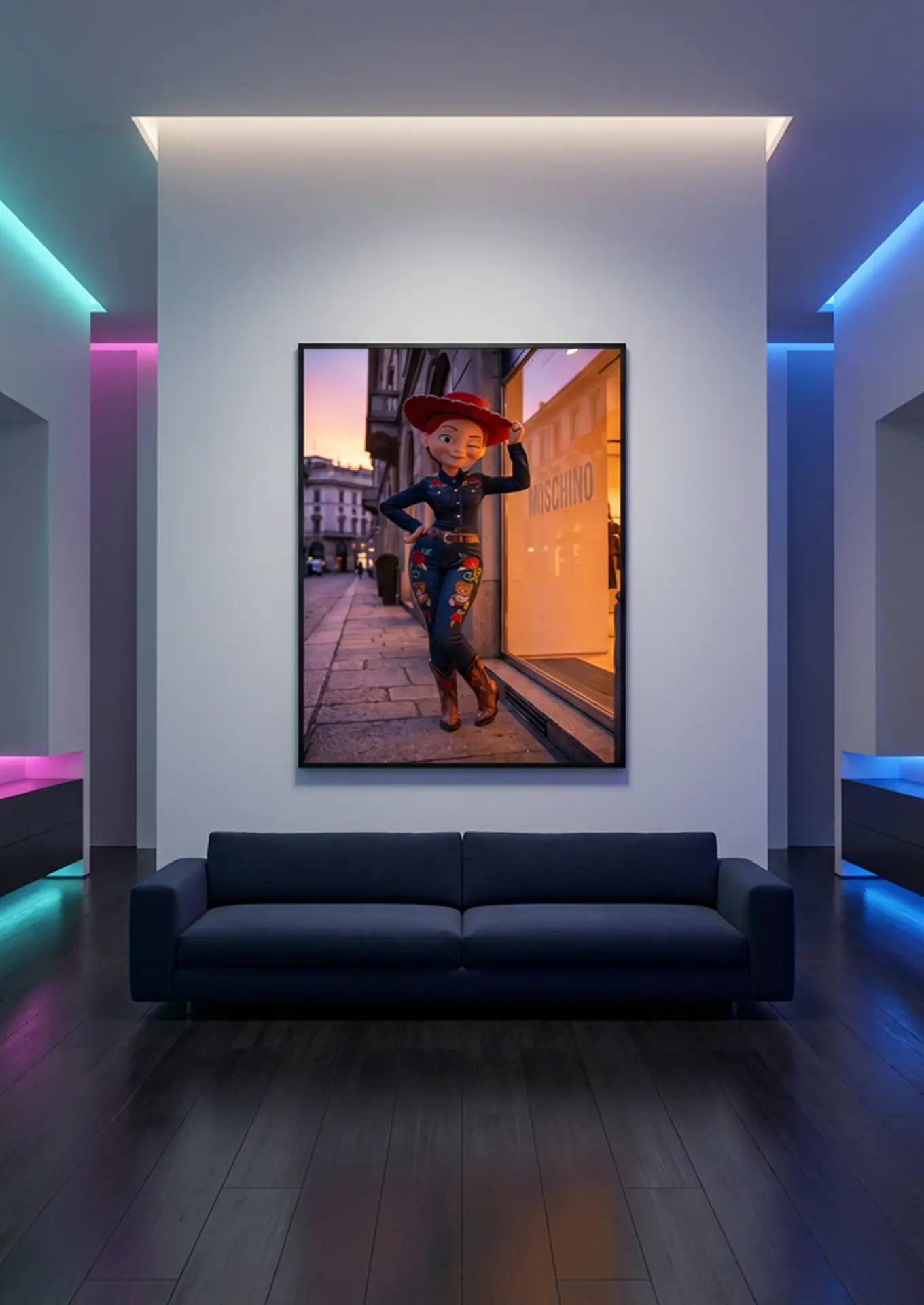 Jessie × Moschino est une œuvre originale Graphic Avenue qui réinterprète l’iconique cowgirl de l’animation à travers l’univers pop, coloré et décalé de la maison Moschino. Sur une rue parisienne élégante, baignée par une lumière dorée de fin de journée, Jessie affirme une posture confiante, libre et résolument moderne.