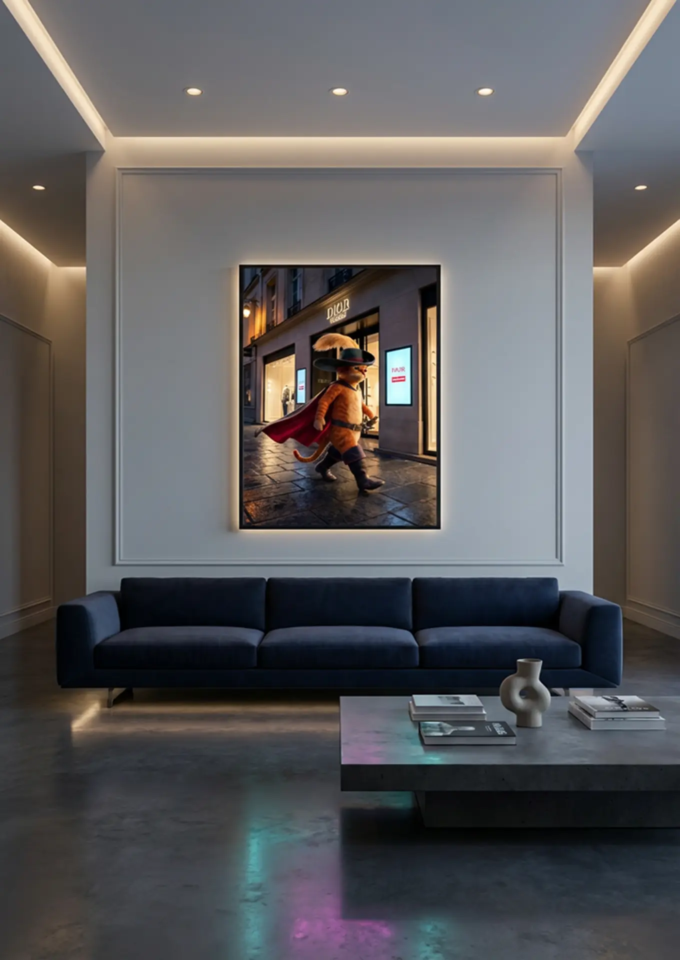 LE CHAT POTTÉ × Dior Homme × Supreme est une œuvre originale Graphic Avenue qui revisite le célèbre félin aventurier en figure urbaine charismatique, marchant avec assurance devant une boutique Dior illuminée. Sa cape flottante, symbole d’héroïsme et de liberté, contraste avec l’esthétique minimaliste et sophistiquée de la mode masculine contemporaine.