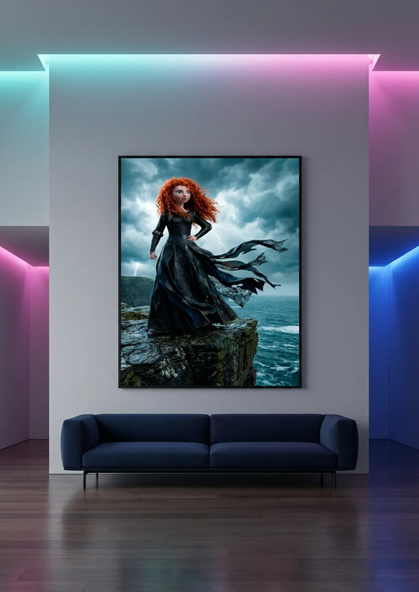 Mérida (Rebelle) × McQueen est une œuvre originale Graphic Avenue qui fusionne l’héroïne indomptable de l’animation avec l’univers dramatique et avant-gardiste de la maison Alexander McQueen. Dressée sur une falaise battue par les vents, Mérida incarne une figure de puissance, de défi et de liberté absolue.