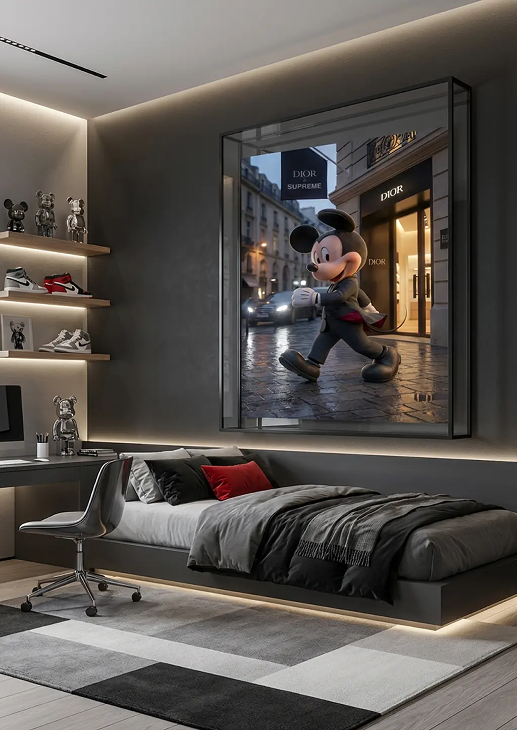 Mickey Mouse × Dior × Supreme est une création originale Graphic Avenue qui fait dialoguer l’icône absolue de la pop culture avec le luxe parisien et l’énergie street contemporaine dans une scène urbaine élégante et iconique.