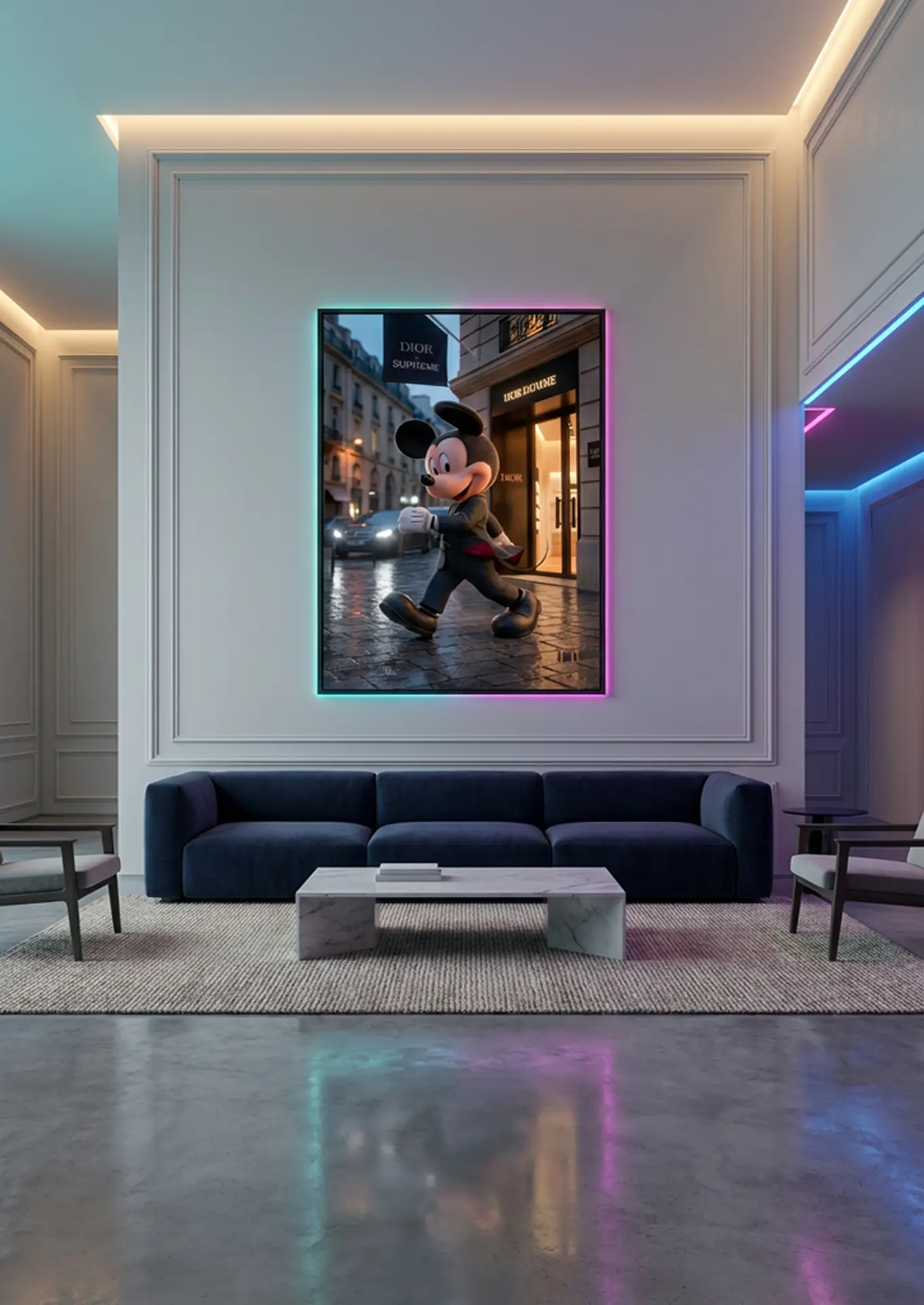 Mickey Mouse × Dior × Supreme est une œuvre originale Graphic Avenue qui met en scène l’un des personnages les plus emblématiques de la culture populaire mondiale dans un décor urbain nocturne, au cœur de l’élégance parisienne. Marchant avec assurance devant la boutique Dior, Mickey devient ici une figure moderne, affirmée et résolument contemporaine.