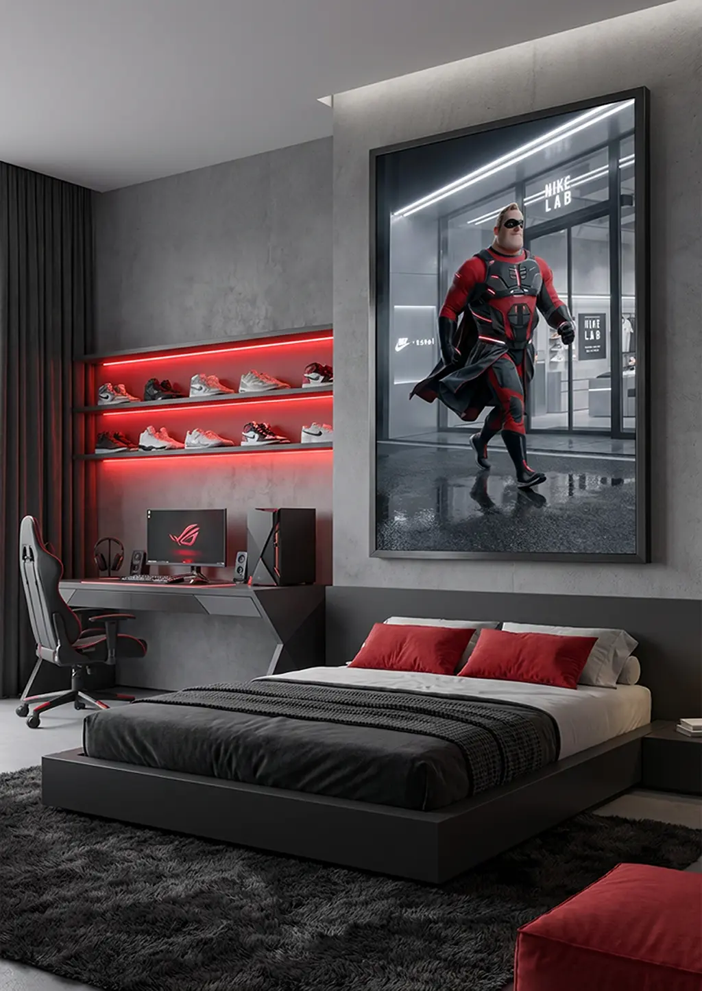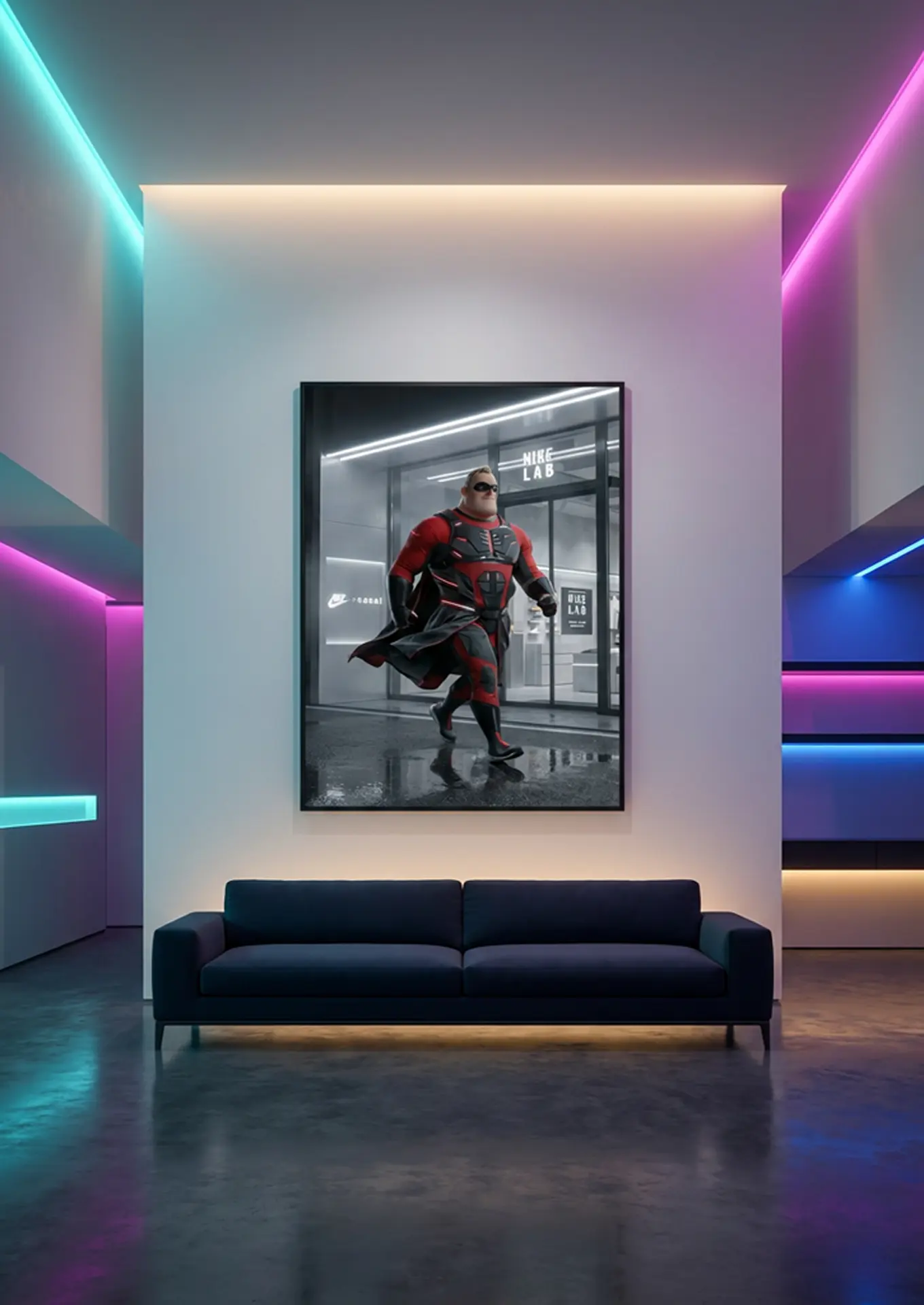 Mr. Incredible × Nike × Sacai est une œuvre originale Graphic Avenue qui met en scène la force brute du super-héros dans un univers urbain nocturne, à la croisée de la performance, du design et de la mode contemporaine. Avançant avec assurance devant une façade Nike Lab, Mr. Incredible incarne ici la maîtrise, la discipline et la puissance en mouvement.