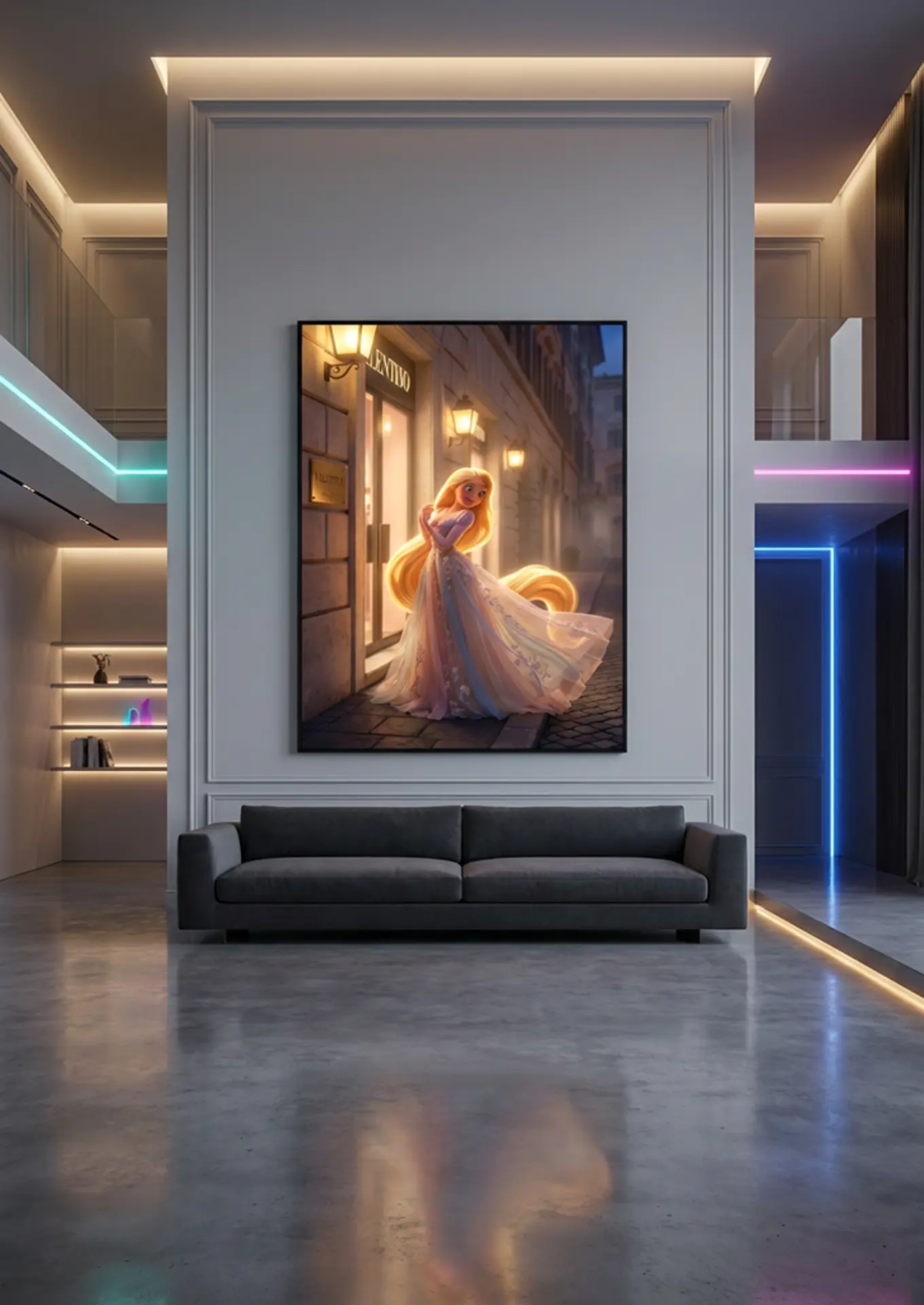 Raiponce × Valentino est une œuvre originale Graphic Avenue qui sublime la princesse iconique dans une scène nocturne élégante, face à une boutique inspirée de l’univers Valentino. Drapée dans une robe haute couture aux lignes fluides et délicates, Raiponce incarne une vision contemporaine du luxe, où la féérie rencontre l’excellence de la mode italienne.