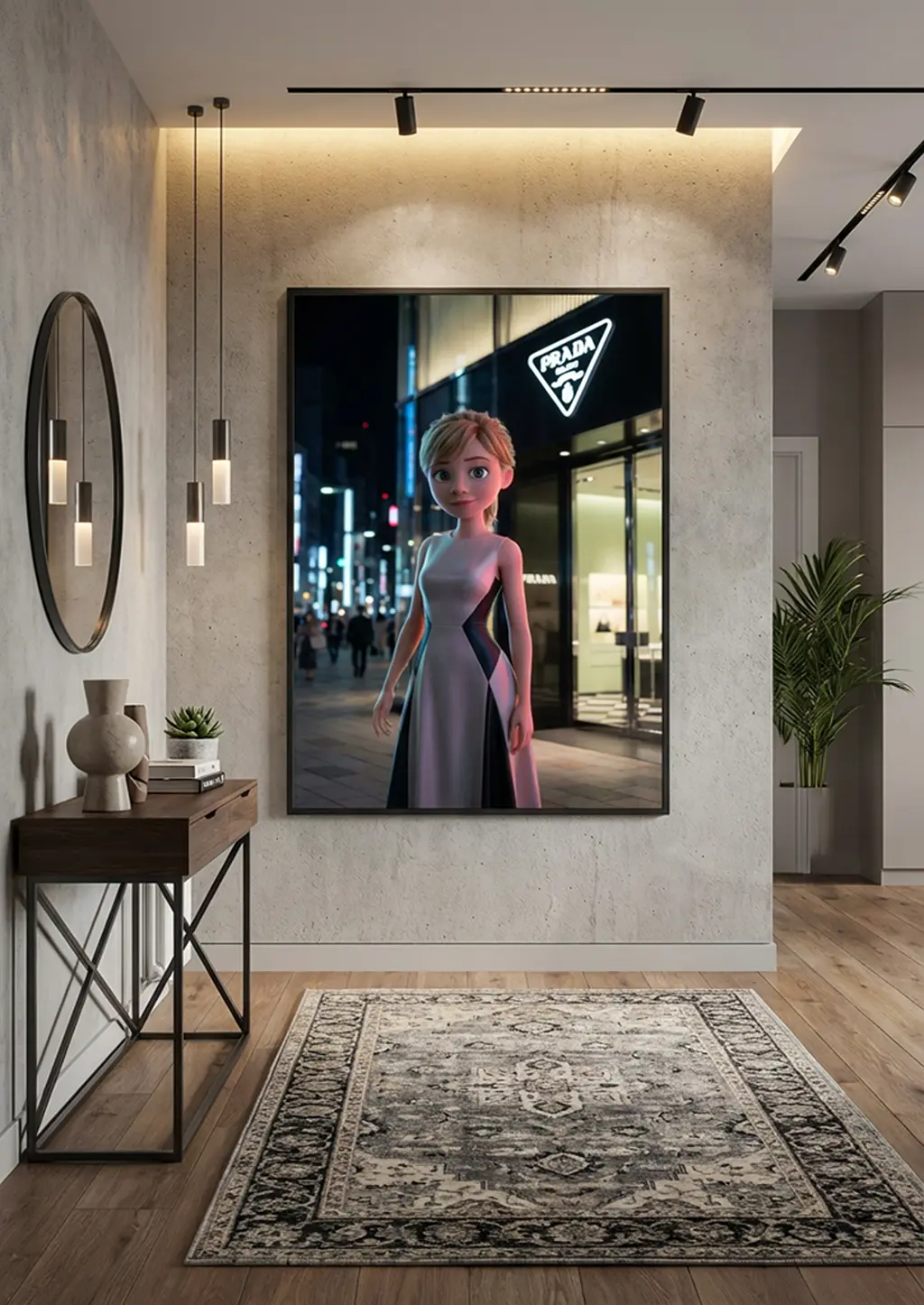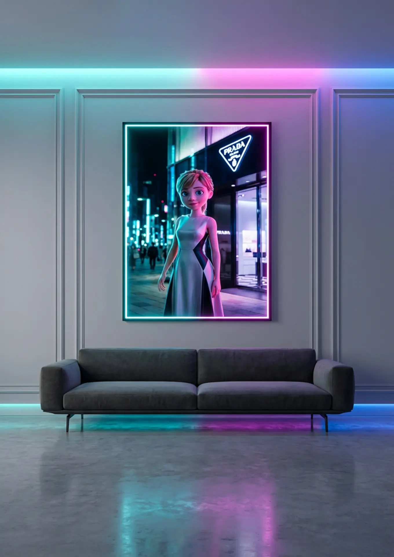 Riley × Prada est une œuvre originale Graphic Avenue qui revisite le personnage emblématique de Vice-Versa dans un univers nocturne sophistiqué, inspiré de l’esthétique épurée de Prada. Devant une boutique lumineuse, Riley apparaît métamorphosée en figure de mode contemporaine, symbolisant la transition entre innocence et affirmation de soi.