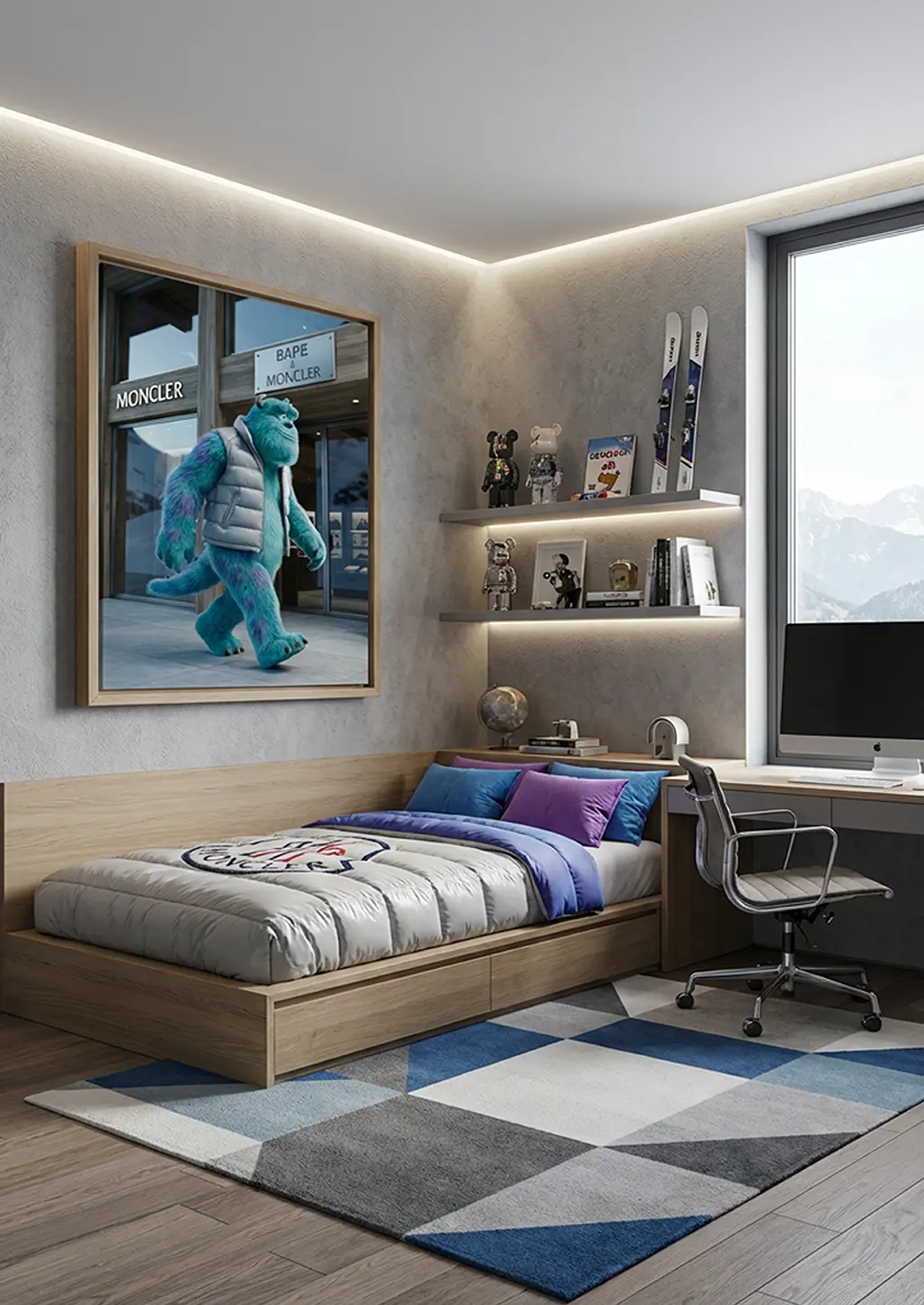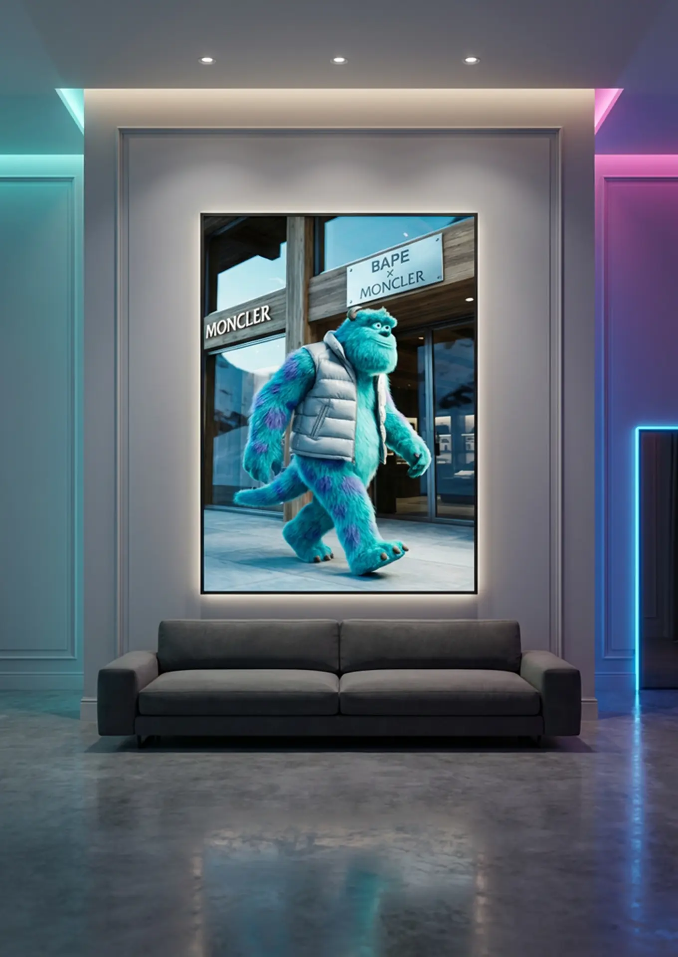 Sulley × BAPE × Moncler est une œuvre originale Graphic Avenue qui fusionne l’univers iconique de l’animation avec les codes du streetwear haut de gamme et du luxe fonctionnel. Représenté en pleine marche devant une boutique Moncler, Sulley incarne une force tranquille, entre douceur visuelle et présence imposante, symbole d’un luxe moderne assumé.