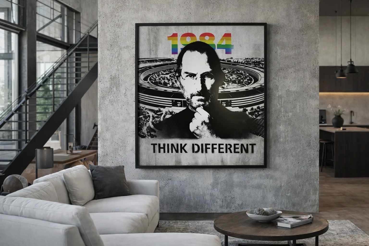 La typographie “Think Different”, intégrée à la composition, agit comme un manifeste. Elle ne se contente pas d’illustrer une époque : elle rappelle une philosophie universelle, celle de l’audace, de la singularité et du courage intellectuel. Les touches chromatiques subtiles en référence à l’histoire visuelle d’Apple renforcent la dimension iconique sans tomber dans la simple nostalgie.