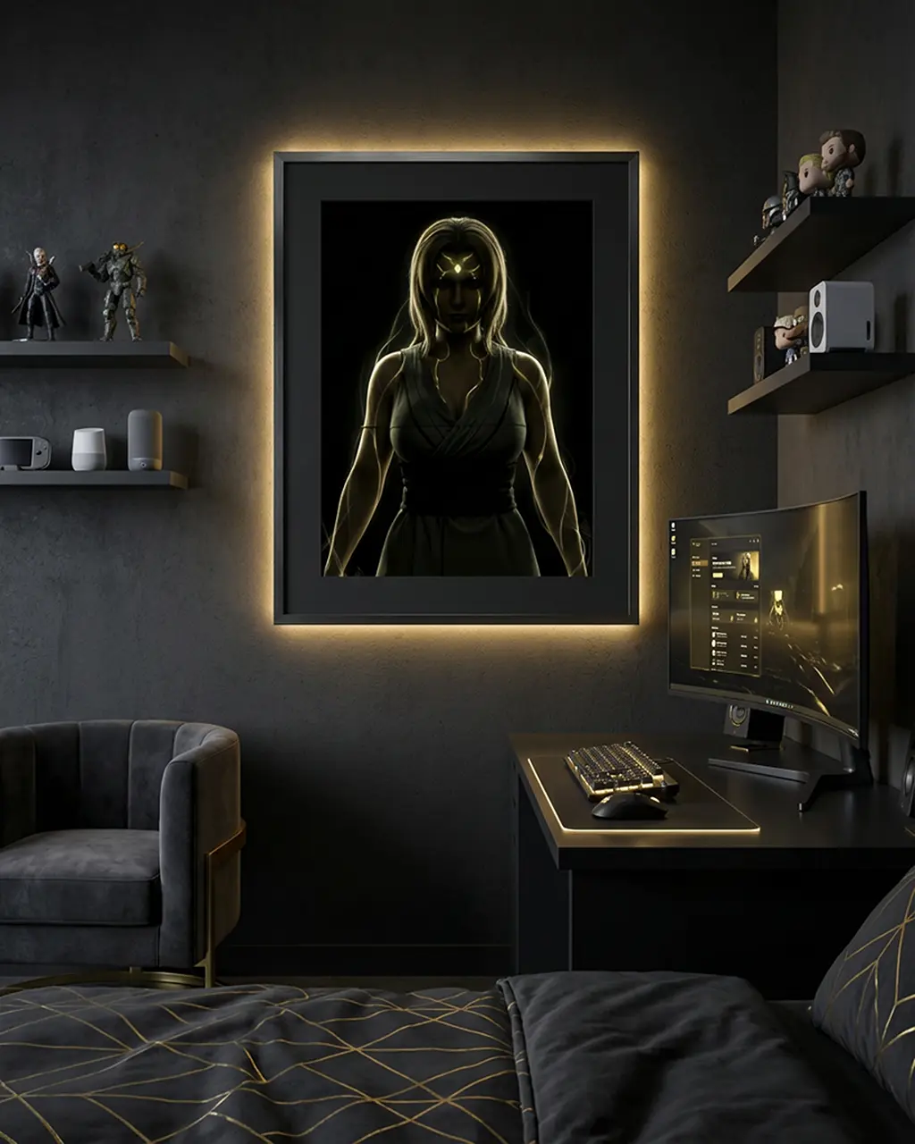 La composition met en scène une silhouette féminine imposante et stable, baignée d’une aura dorée qui souligne la maîtrise totale de l’énergie. Les lignes du corps sont fermes, affirmées, traduisant une force contenue plutôt qu’exhibée. Le regard frontal et la posture ancrée expriment une autorité naturelle, forgée par l’expérience et la responsabilité.